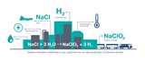 Illustration showing the production process of sodium chlorate. Sodium chlorate is produced by the electrolysis of brine (sodium chloride and water)